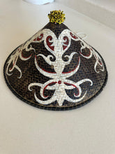 Bali’nin geleneksel el sanatlarından ilham alan bu konik formdaki dekoratif şapka, doğal hasır dokusu ve etnik motifleriyle yaşam alanlarına özgün bir karakter kazandırır. El boyaması beyaz ve kırmızı desenleri, koyu zeminle güçlü bir kontrast oluşturarak dikkat çekici bir görünüm sunar. Duvar dekoru veya otantik aksesuar olarak kullanılabilir.